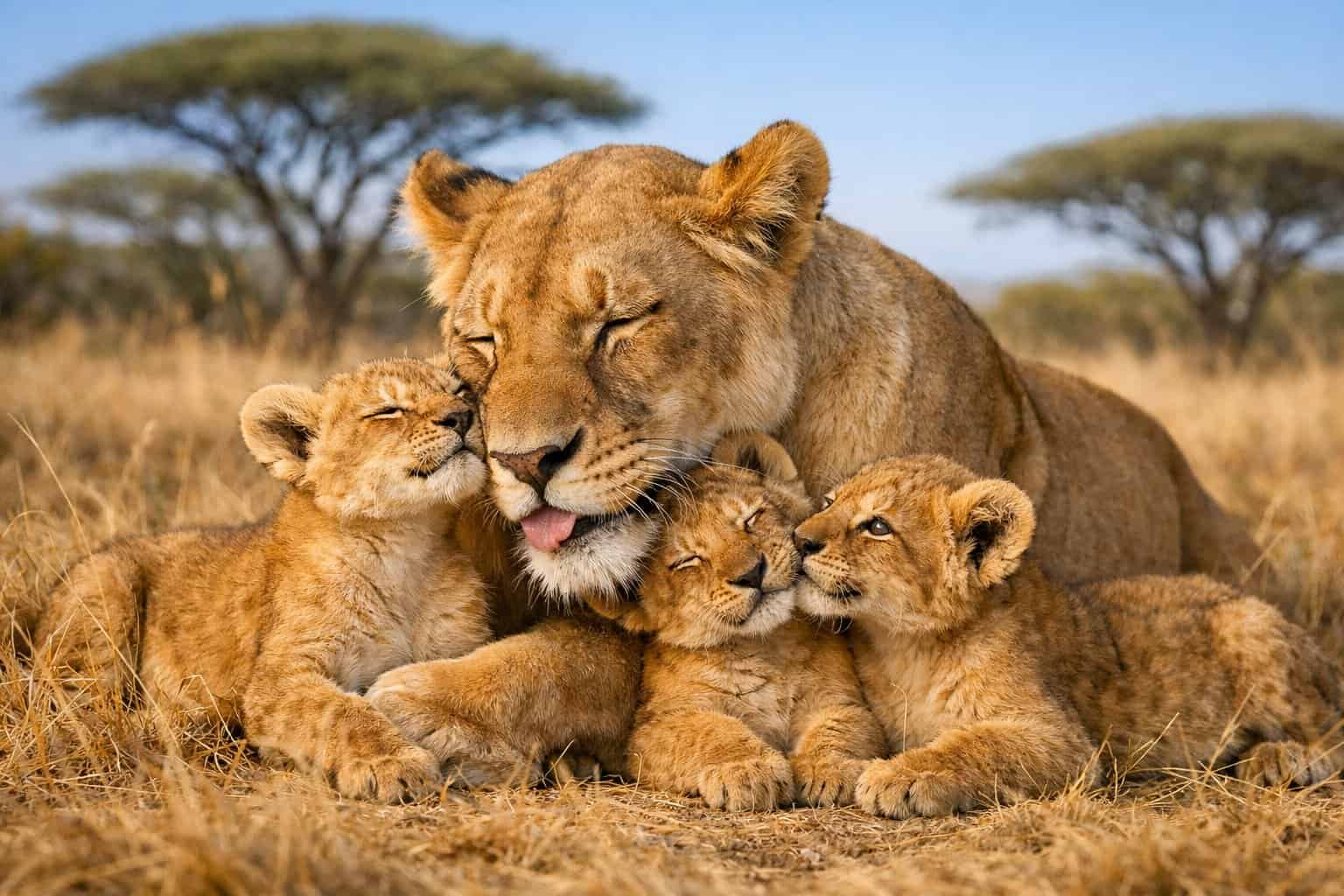 Lionesses lick their cubs to clean them and strengthen social ties. You might see a mother licking her cub’s face or ears—that keeps the little one clean and helps it relax.