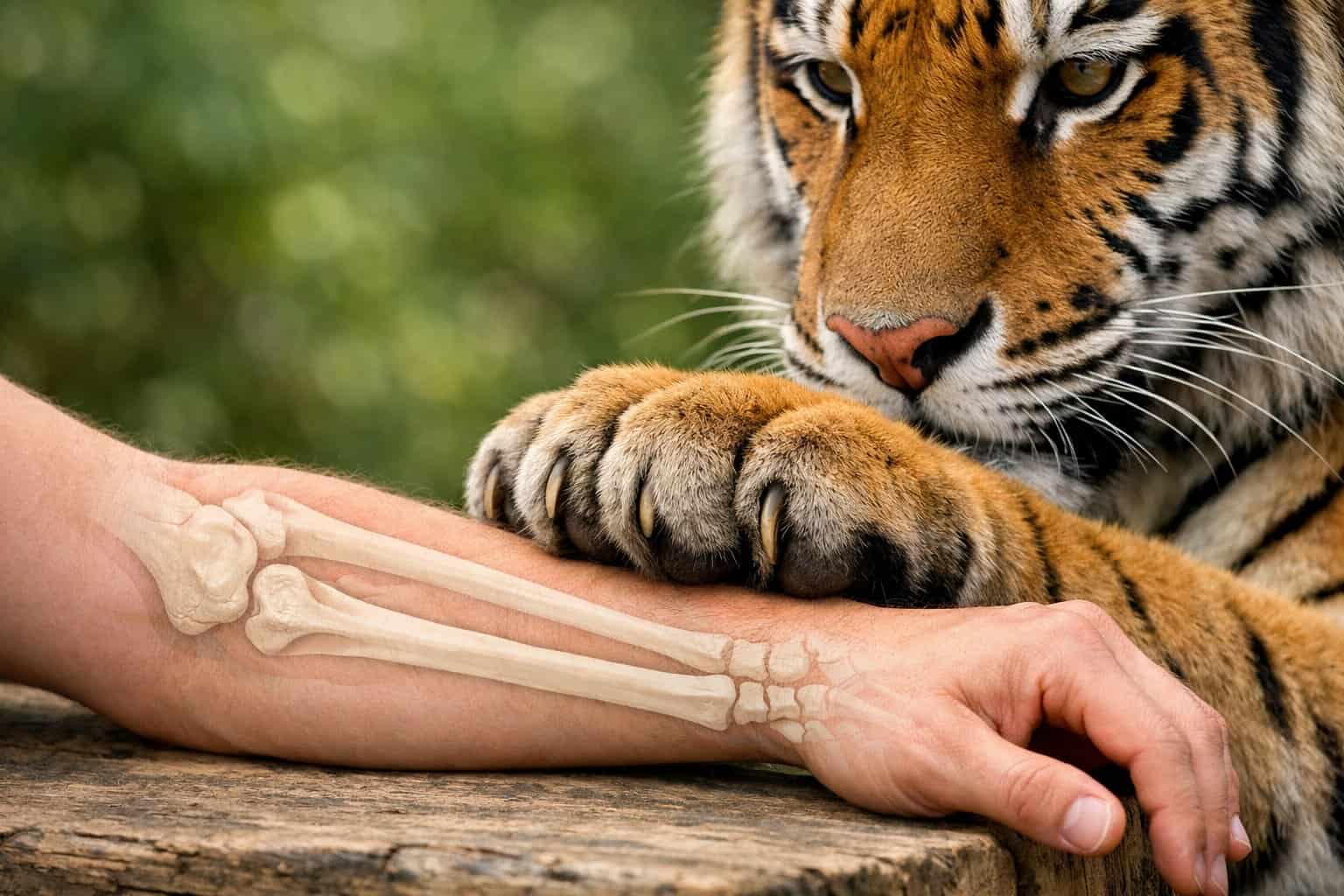 Tigers hit with enough force to damage bones, tear skin, and destroy organs. Their bite pressure, jaw shape, and those nasty claws all make bone fractures way more likely in an attack.