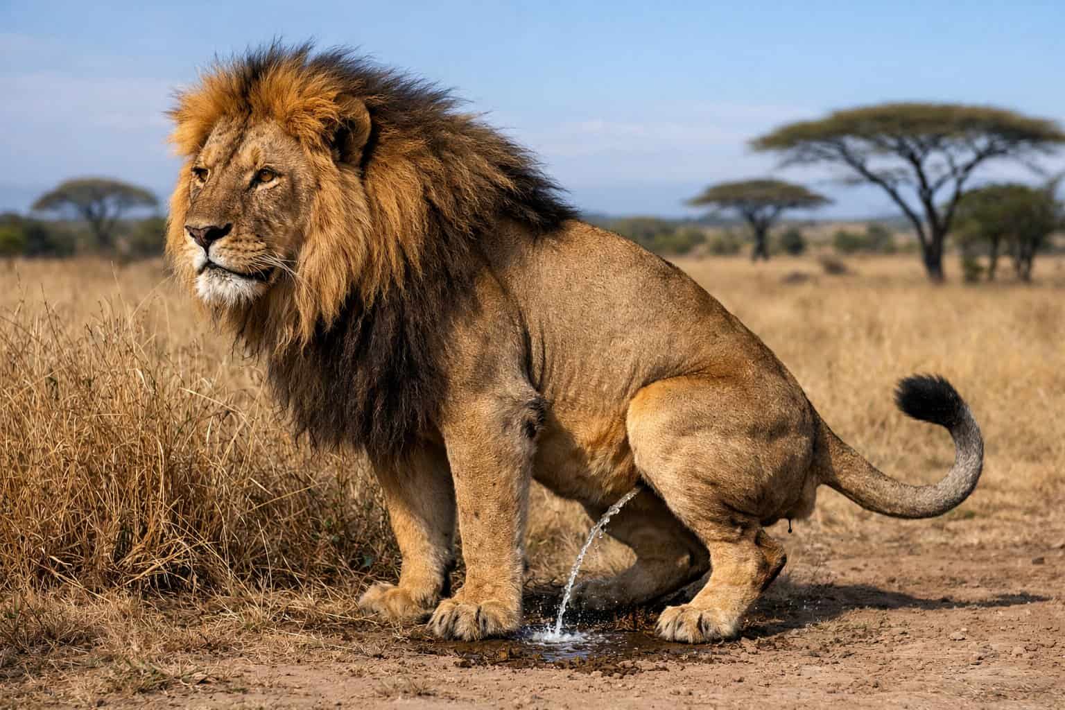 Picture this: a huge male lion lifts his tail, aims, and sprays a burst of urine onto a bush or rock. Male lions usually pee while standing, and they really aim their stream to mark territory and send strong scent messages to other lions. This simple act lets them claim land, warn rivals, and show dominance to any nearby groups.