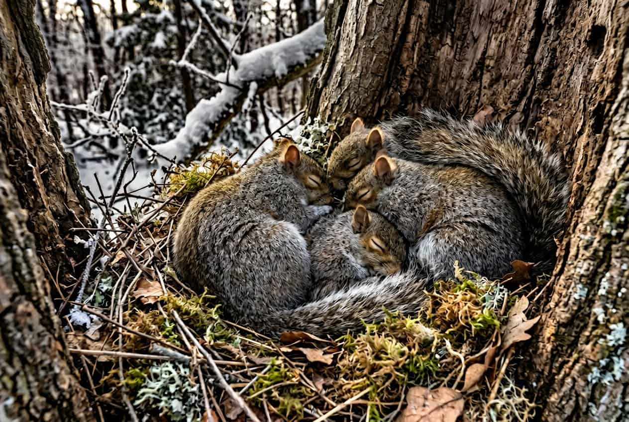 Some squirrels—especially certain species or family groups—share dreys on the coldest nights. When they huddle, their combined body heat can raise the nest’s temperature by several degrees. That helps everyone inside stay warmer with less effort.