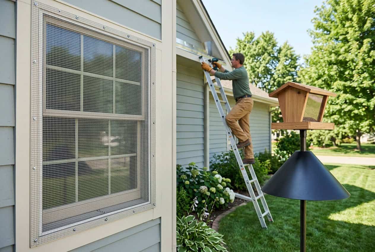 Move bird feeders farther from the house—use pole-mounted feeders 15–20 feet away and at least 6 feet off the ground.
