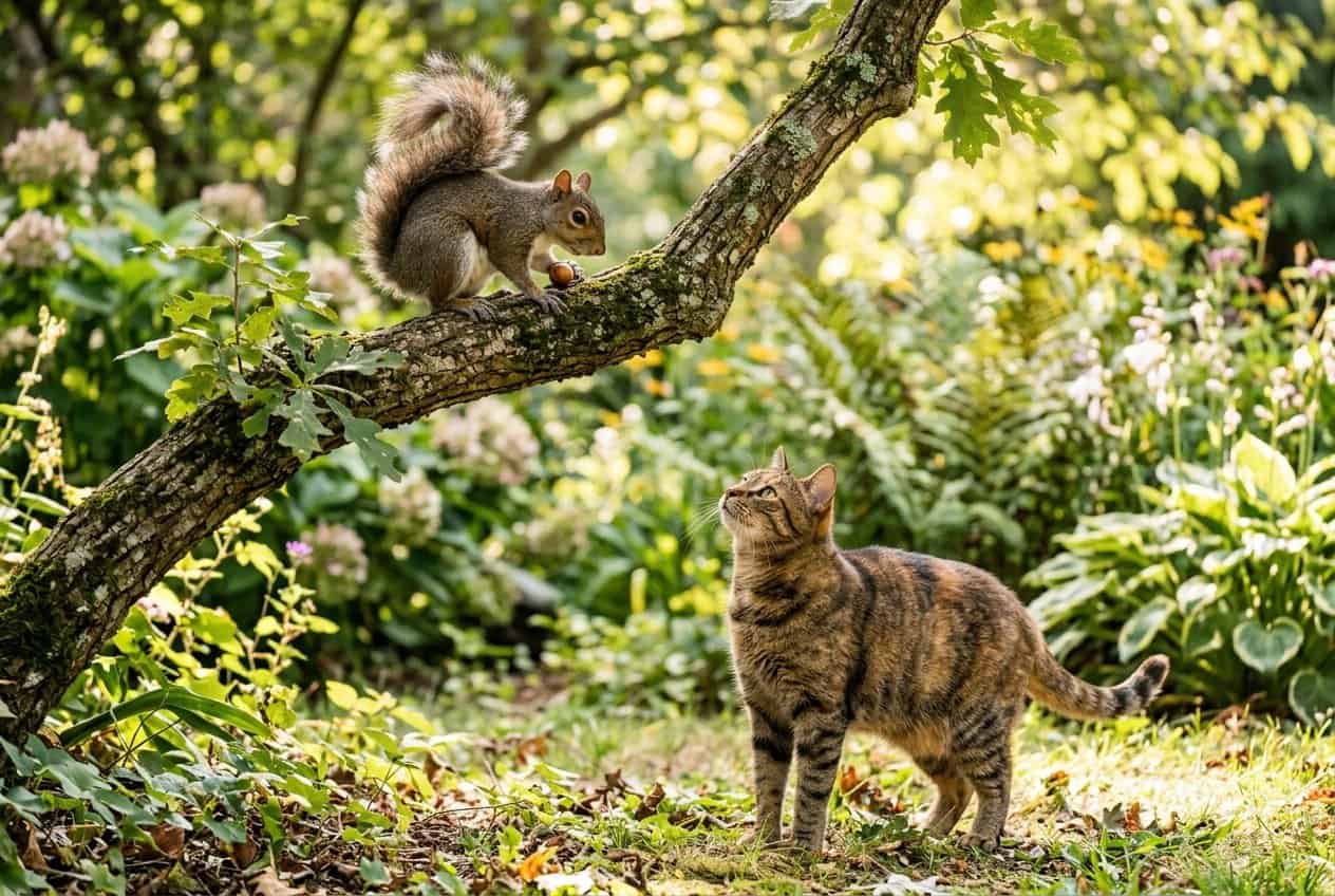 Trees and thick shrubs give squirrels a huge advantage. You’ll see them dart up trunks, dash along thin branches, and take overhead routes that cats just can’t follow safely.