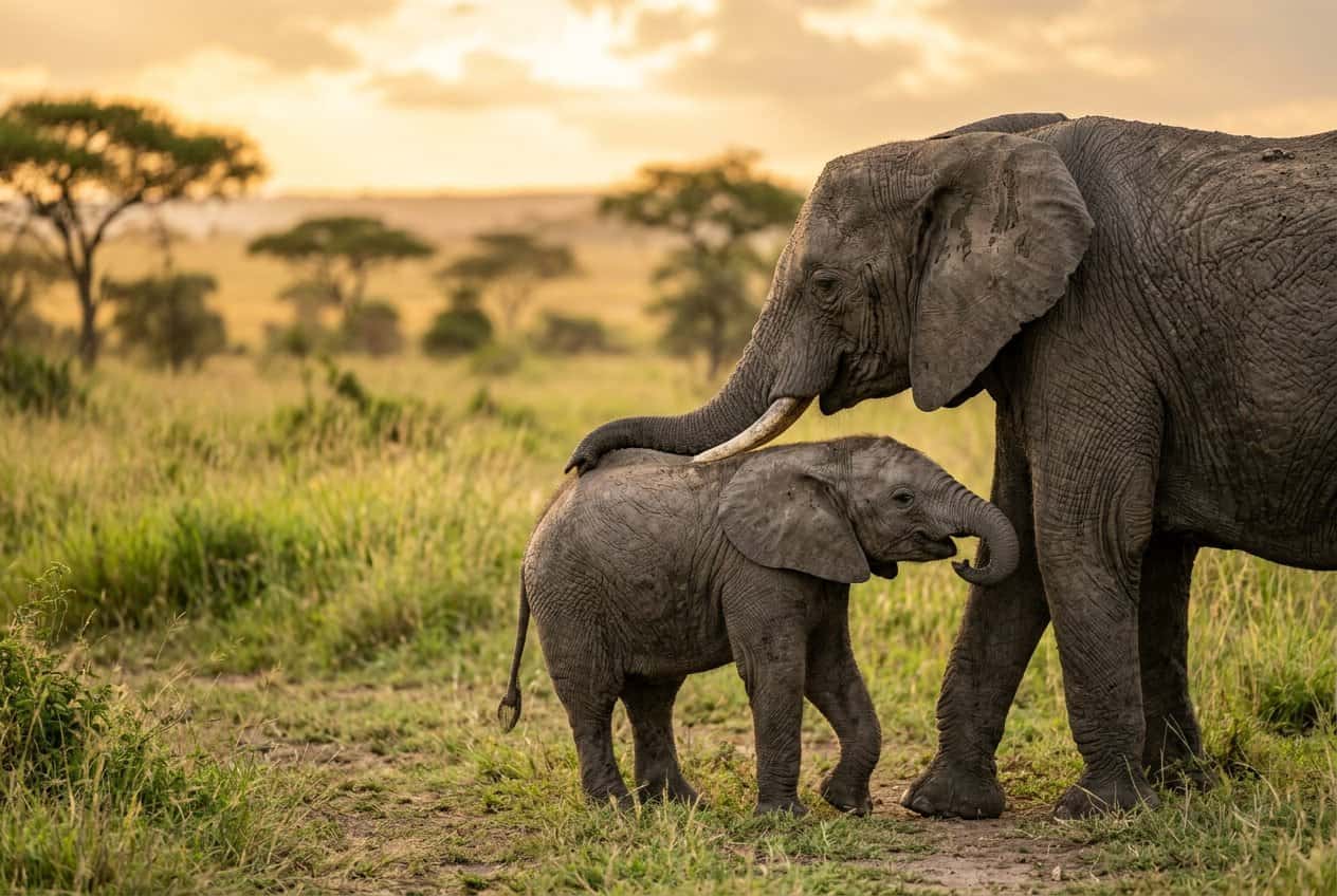 Calves stay close to their moms during daily walks and at night. You’ll see moms use their trunks to nudge or lift the calf, and the whole family circles up if there’s danger.