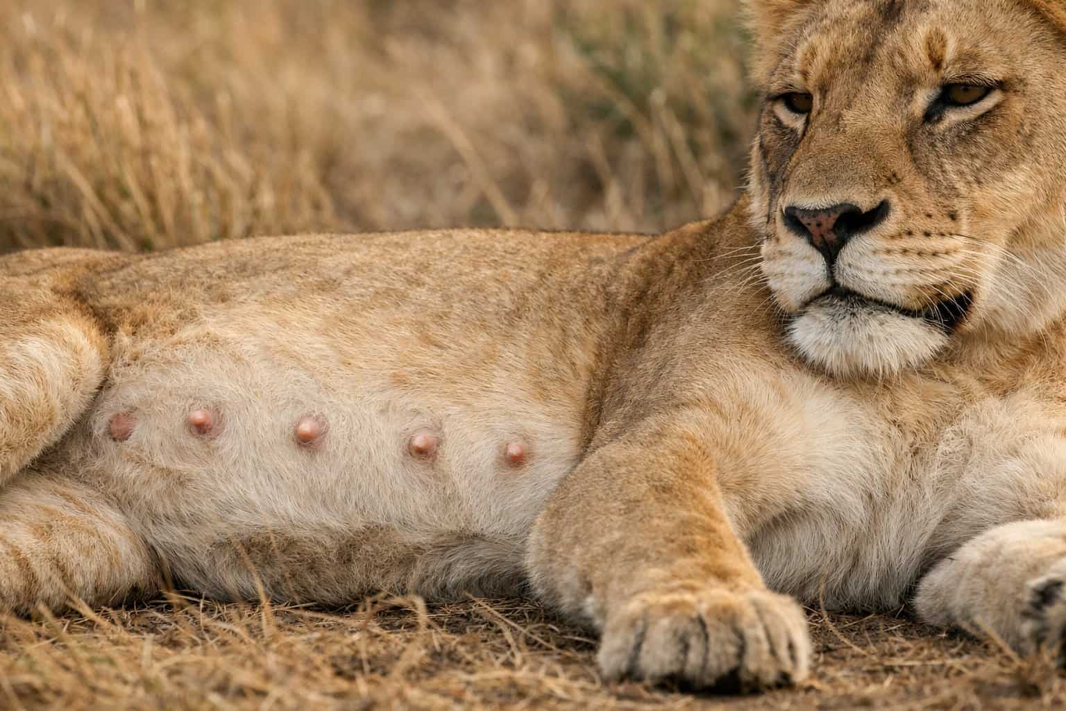 They’re covered by fur, but you’ll spot them more easily when the lioness is nursing or lactating. Sometimes, field guides or vet notes call them “mammary teats.”