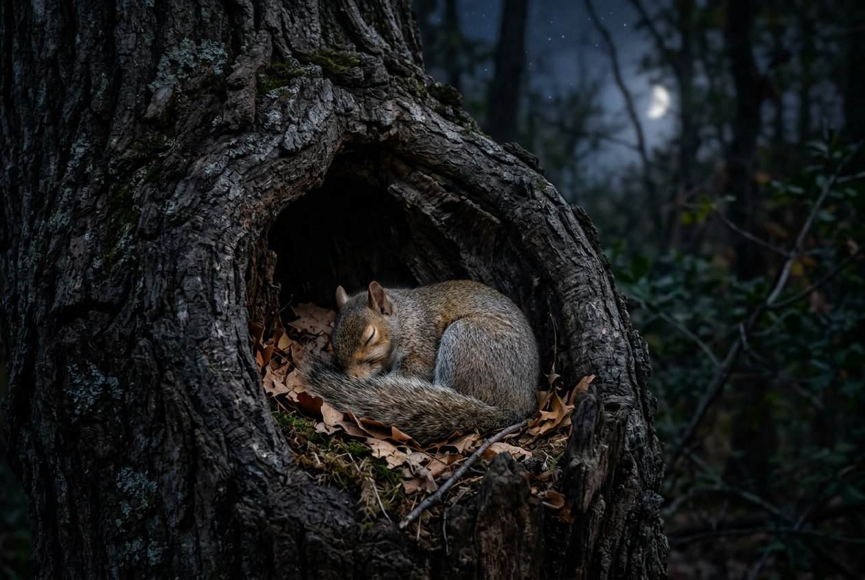 When night falls, you’ll usually find squirrels in one of four spots: leafy nests high up, tunnels underground, snug tree hollows, or sometimes in man-made places like attics. Each shelter type gives its own kind of protection and works best for different squirrel groups.