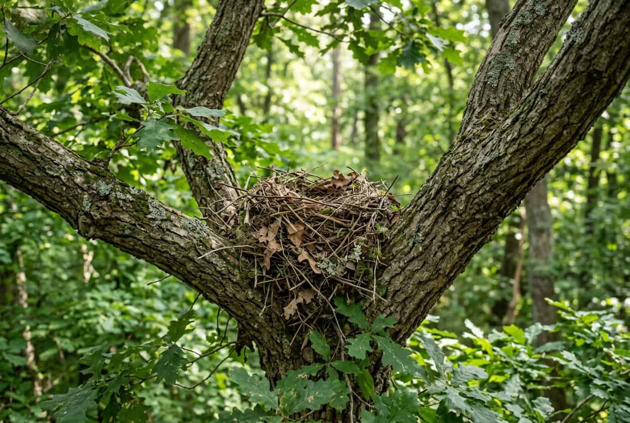 Dreys usually perch on strong forks 20–60 feet up, where branches cut the wind. Squirrels don’t settle for just one—they build several dreys around their territory and switch between them.