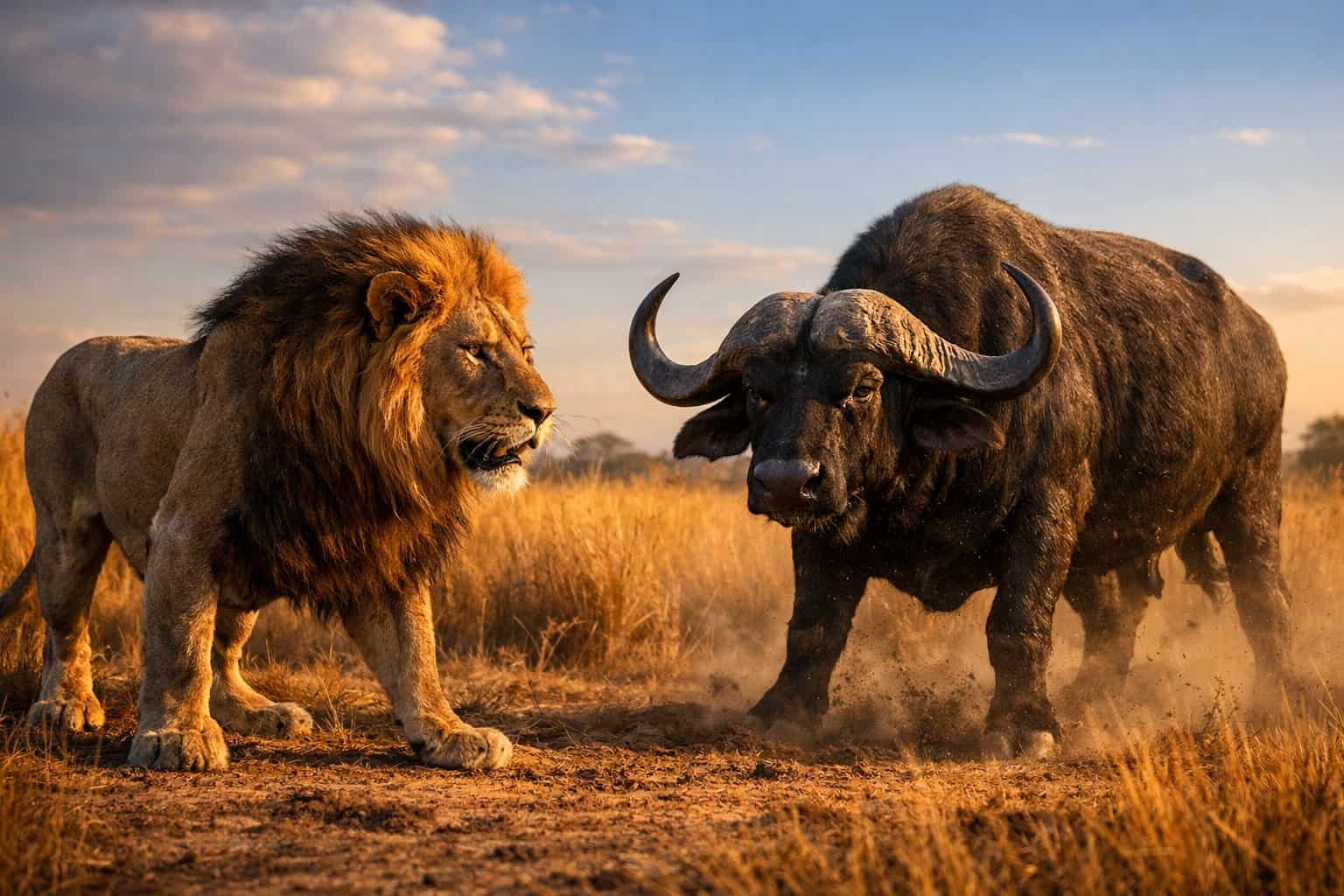 Cape buffalo are some of the most dangerous prey for lions in Africa. They weigh 500–900 kg and gather in big, aggressive herds that protect their own.