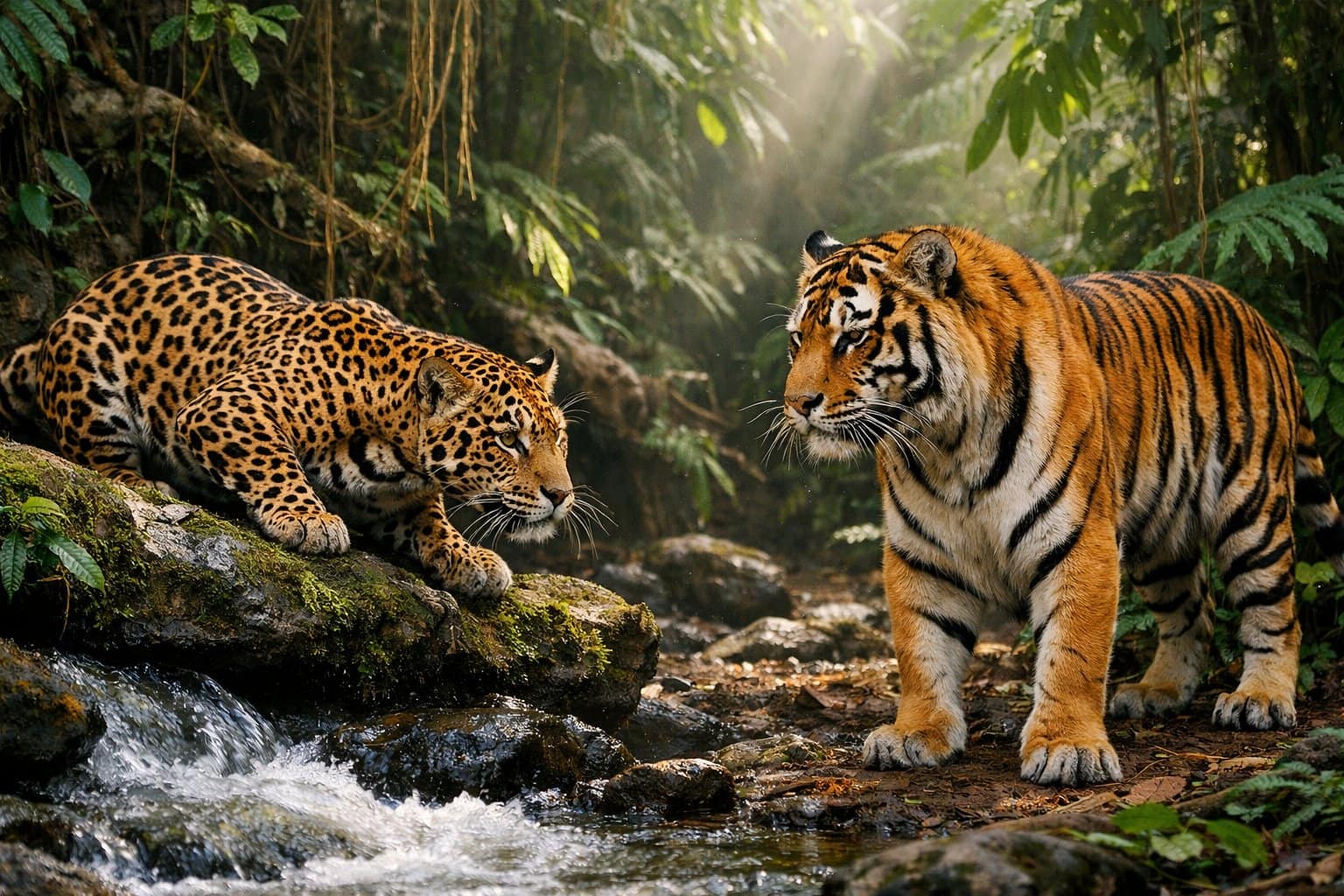 Both are apex predators built for killing. Tigers favor sustained power and reach. Jaguars excel at concentrated, crushing strength and sneaky agility in dense jungle.