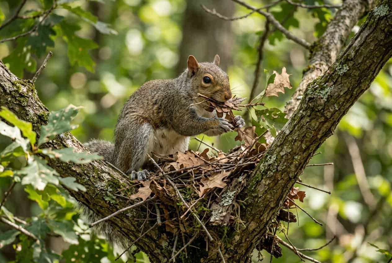 When natural materials are scarce, squirrels grab insulation, shredded paper, or bits of cloth. In urban areas, they prefer mature trees near buildings, but they’ll move into wall cavities or chimneys if they can.