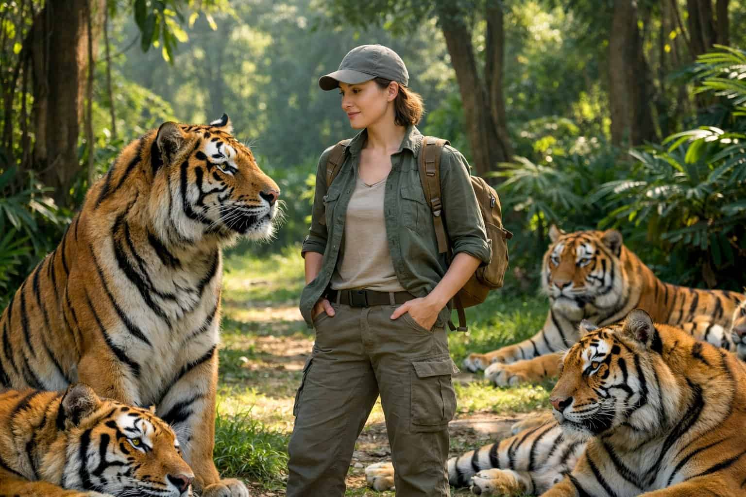 You’ll meet tigers that stand calmly beside people who act like family, authority, or even danger. These tigers trust or just ignore those people after years of familiarity, training, or simply because there’s no threat.