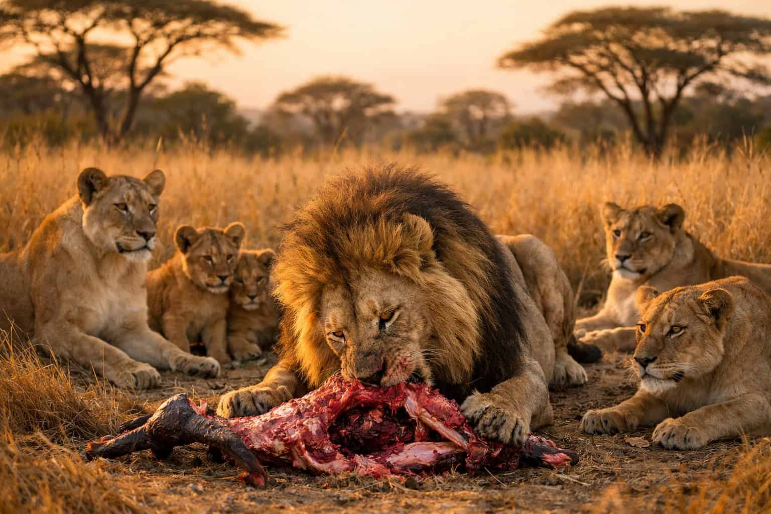 A pride’s mealtime follows a pecking order, but it isn’t always strict. Adult male lions usually eat first because they defend territory and keep rivals at bay.