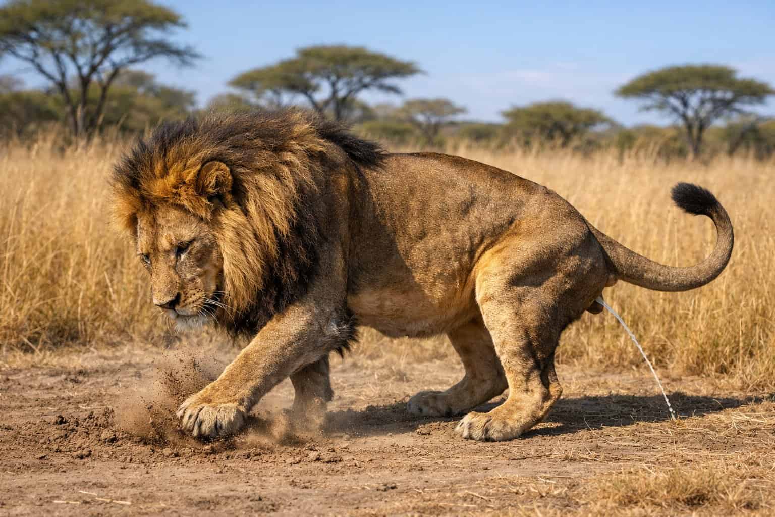 Lions scratch before or after urinating to mix paw gland scents with their urine, making a clearer, longer-lasting territorial message.