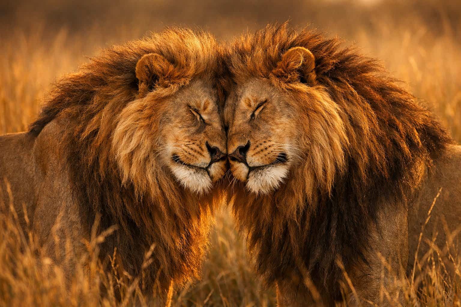 Head rubbing keeps coalition partners close and cooperative. When two male lions in a coalition press their heads together, they swap smells and calm each other down.
