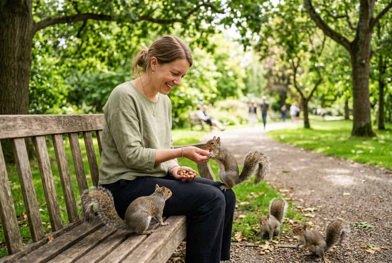 Squirrels don’t always take food from your hand, but they’ll sit nearby and wait. You might spot them climbing onto a bench or hopping just a few feet away.