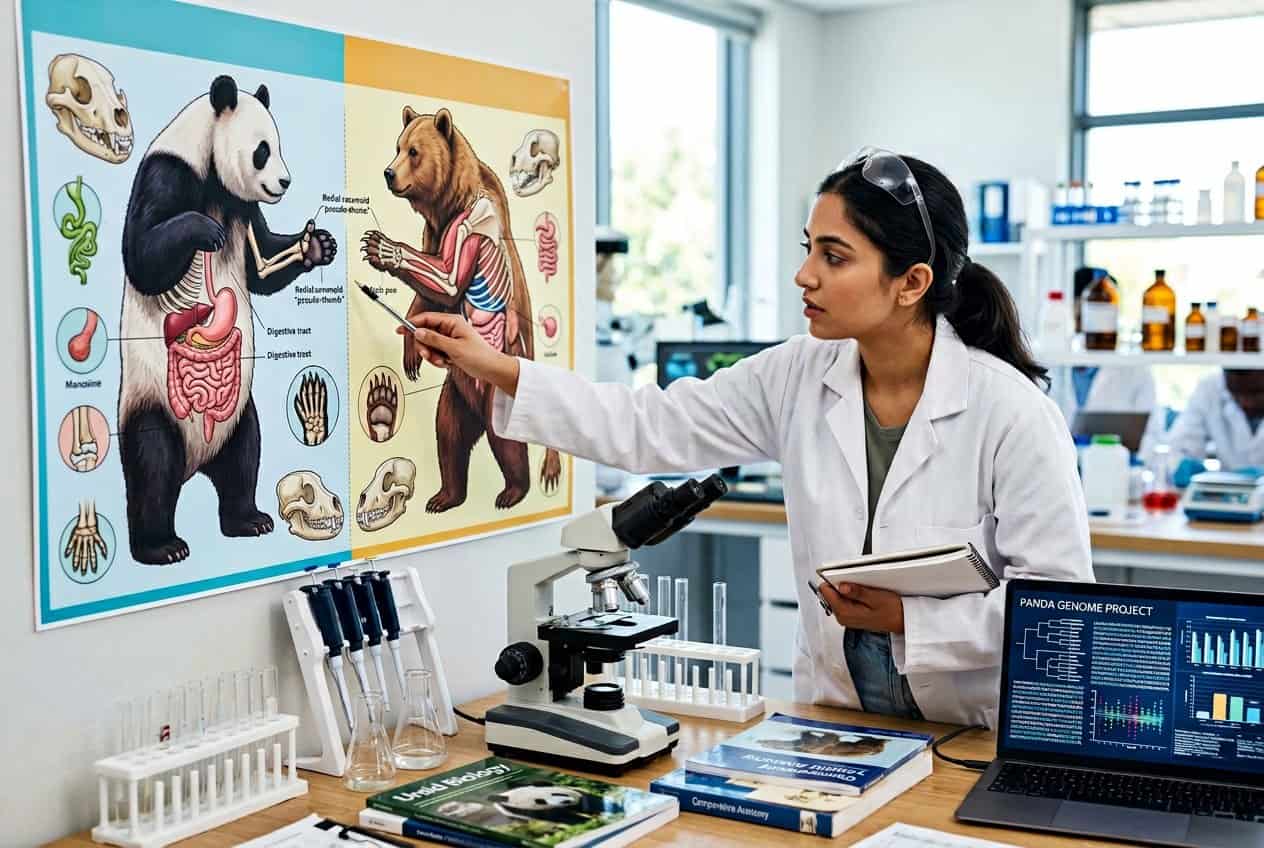 Red pandas and giant pandas look a bit alike, but they’re not close relatives at all. The matching fur patterns and the false thumb? They evolved those separately—a classic case of convergent evolution.