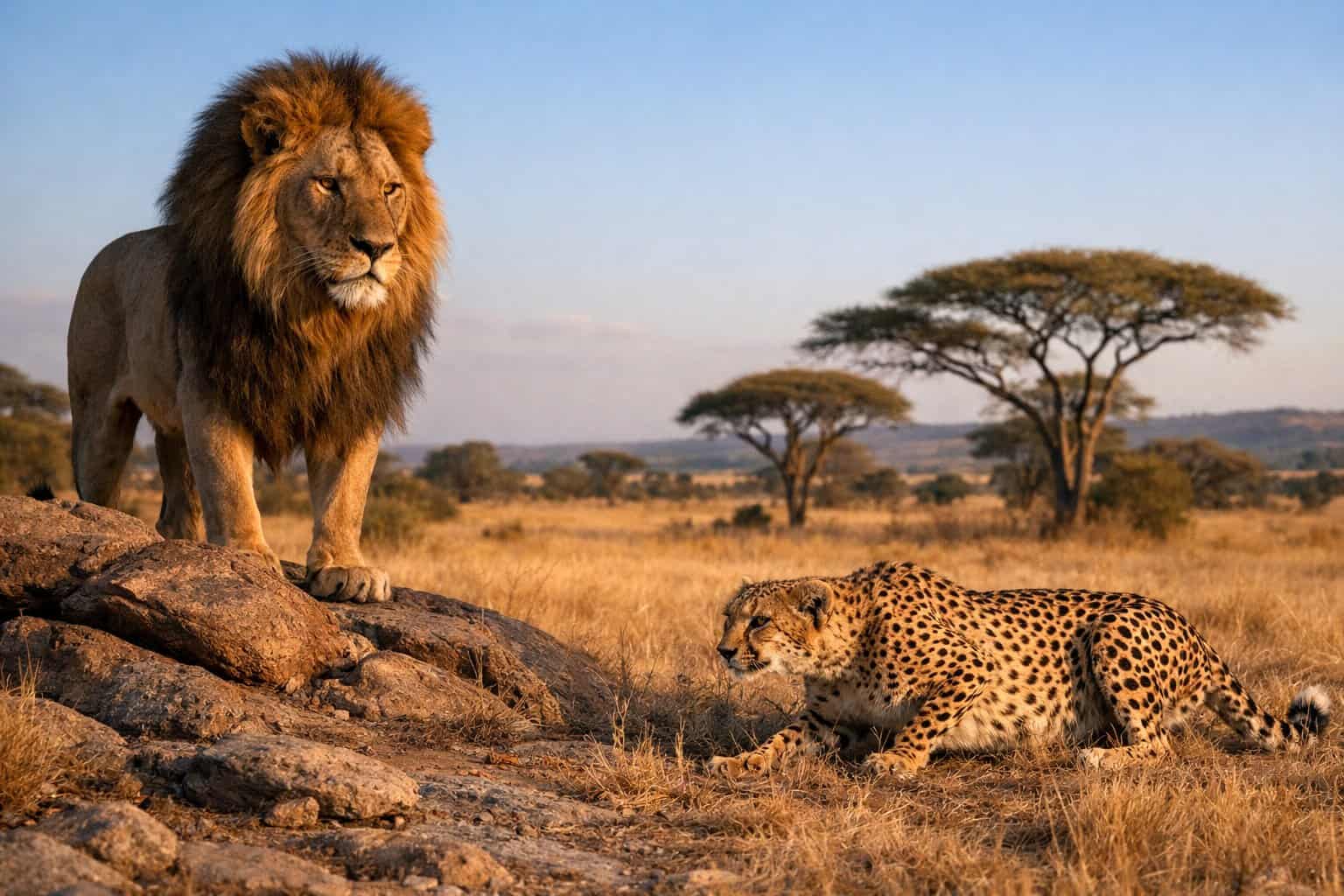 If they do clash, the lion’s fighting skills and toughness almost always win out. Maybe a cheetah could land a lucky hit, but the lion’s bite and strength usually settle things fast.