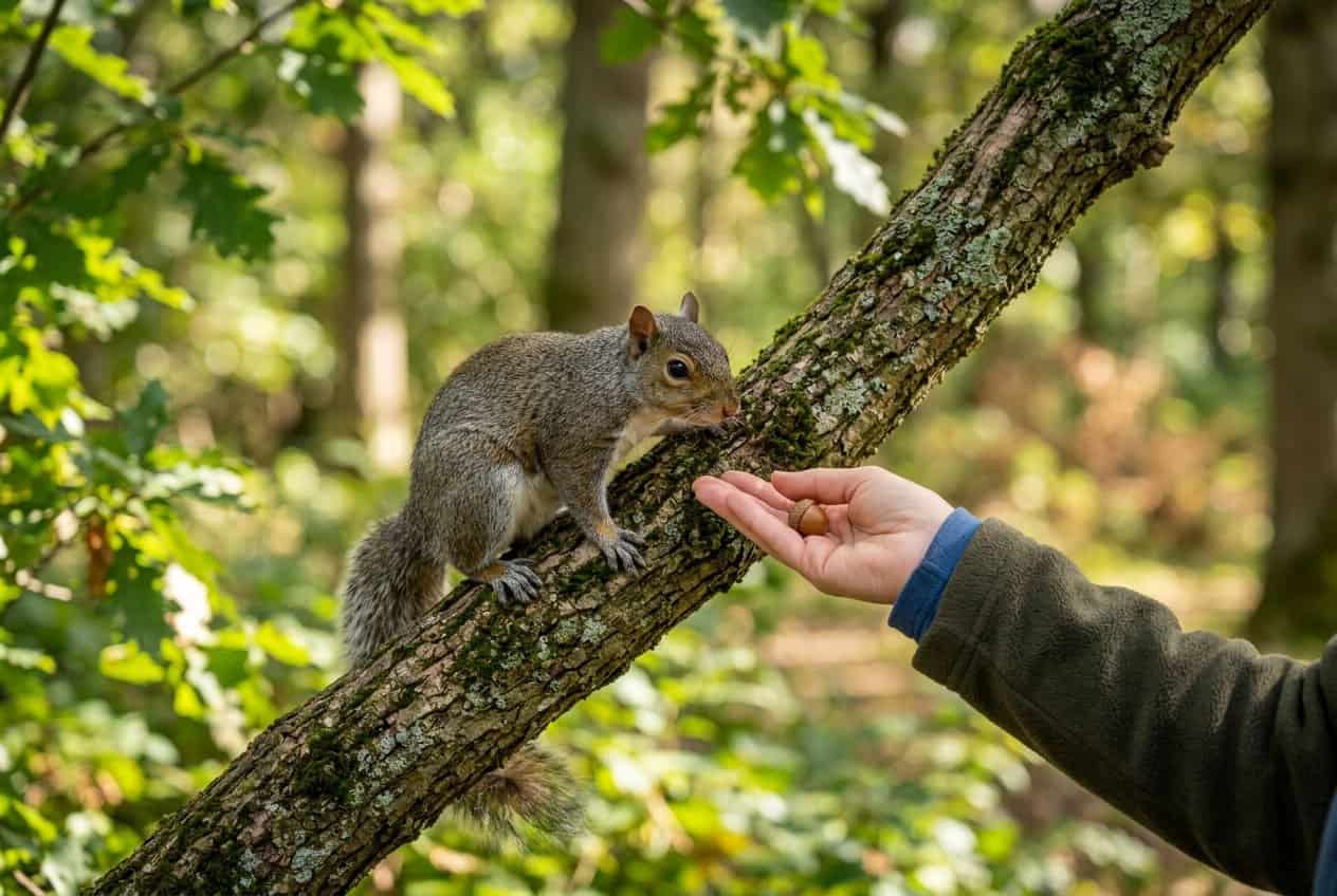 Sudden moves or reaching hands toward a squirrel usually make things worse.